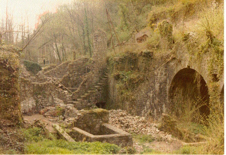 Mells Lower Works in 1980 - the lower site showing one of the Tilt Hammer arches and the old gas holder (JF)