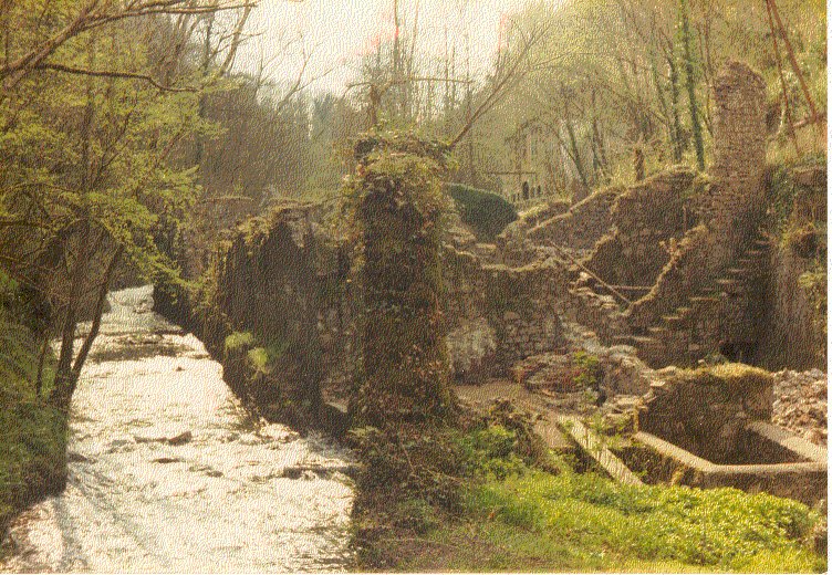 Mells Lower Works in 1980 - the lower site showing the old gas holder and the Mells River (JF)